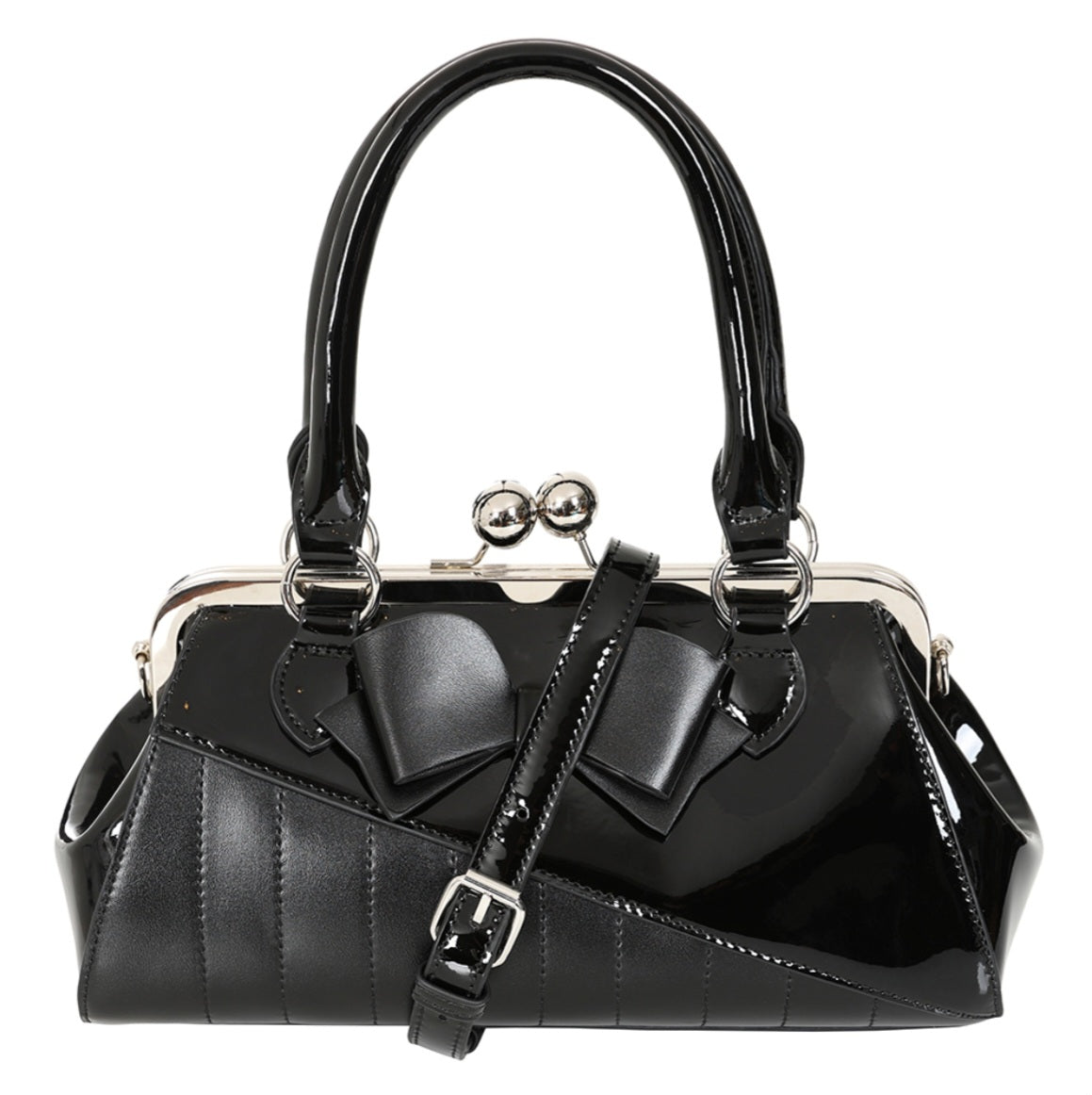 Vegan friendly PU handbag with kiss clasp, bow detail, red leopard print lining and detachable shoulder strap. Measures 33x16x11.5cm.