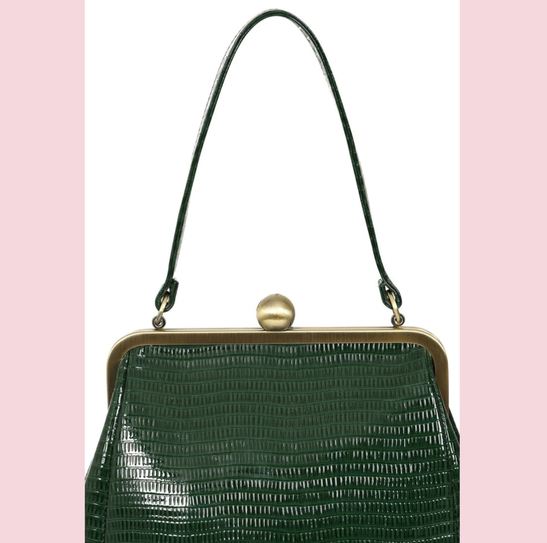 Vegan friendly PU handbag with kiss clasp and detachable shoulder strap. Measures 23x21x10cm.