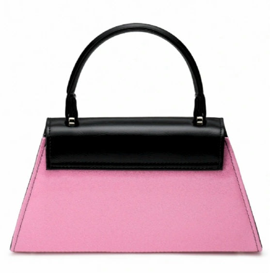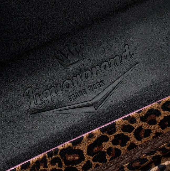 Vintage classic vegan leather handbag with leopard print lining and Liquorbrand's signature metal chevron detail. Detachable shoulder strap. Measures 28x15x8cm.
