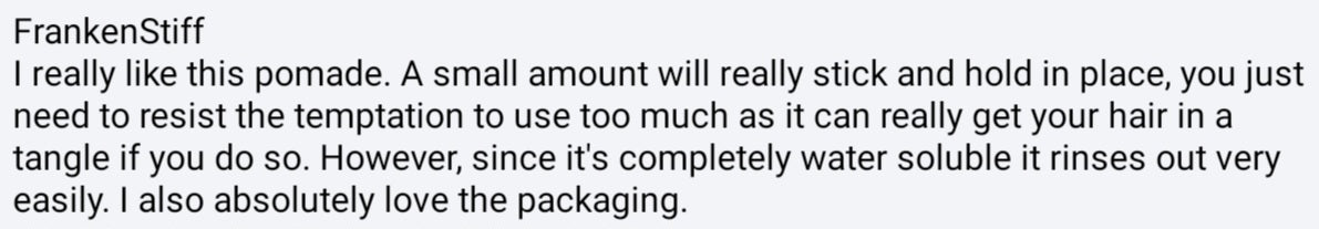 Extra firm hold pomade, semi gloss shine with Argan oil. Vegetarian and cruelty free. 113g.